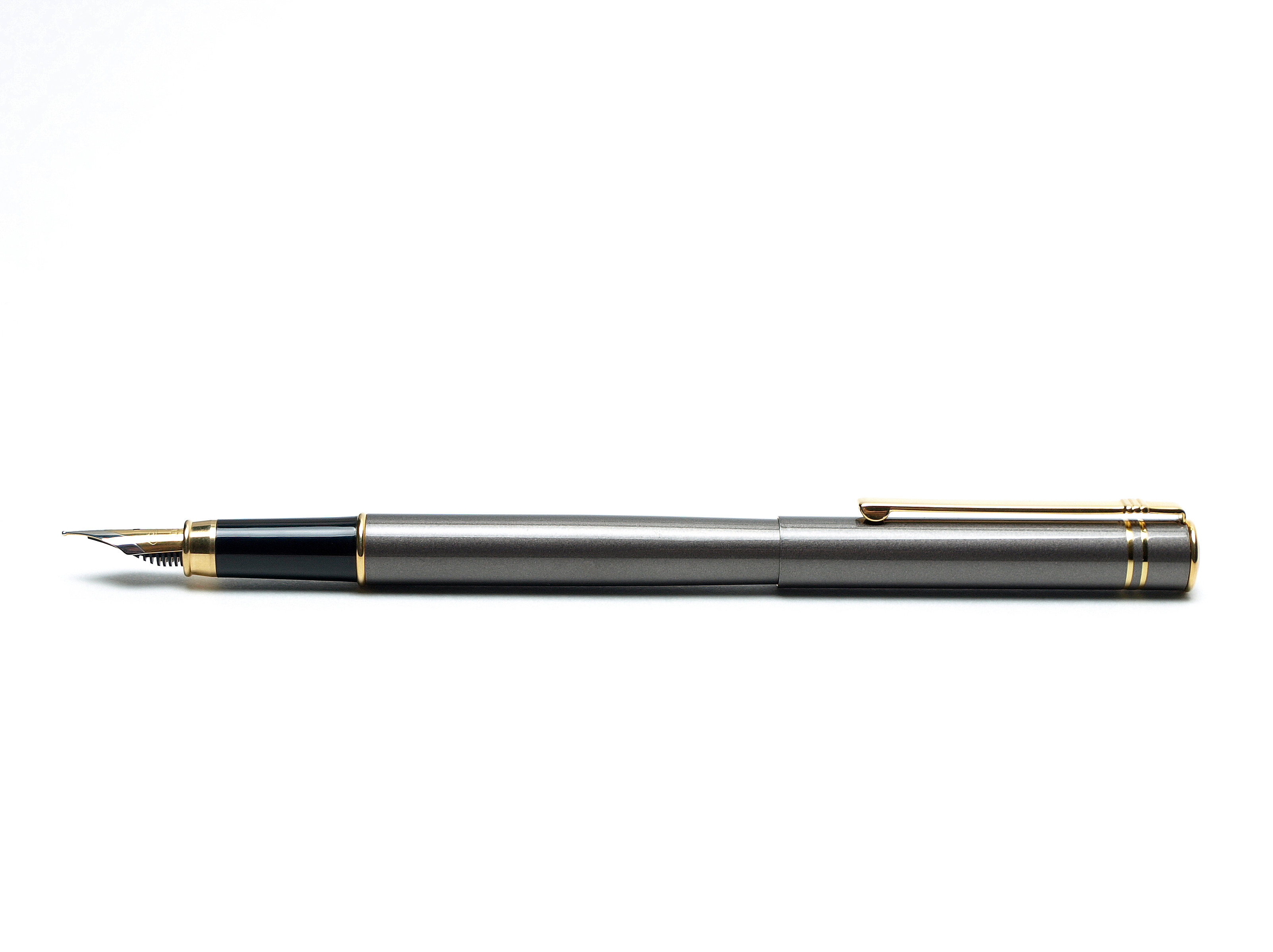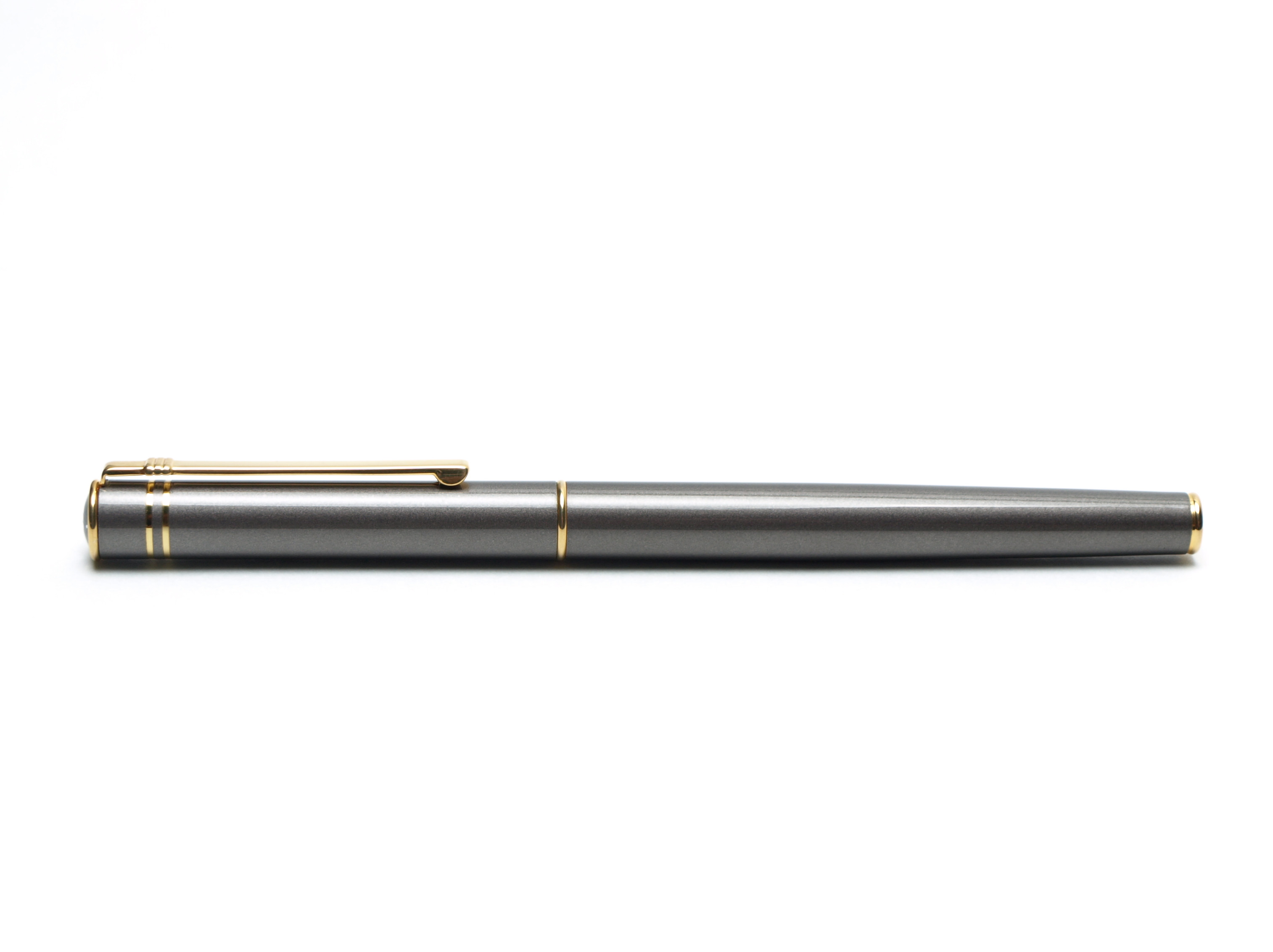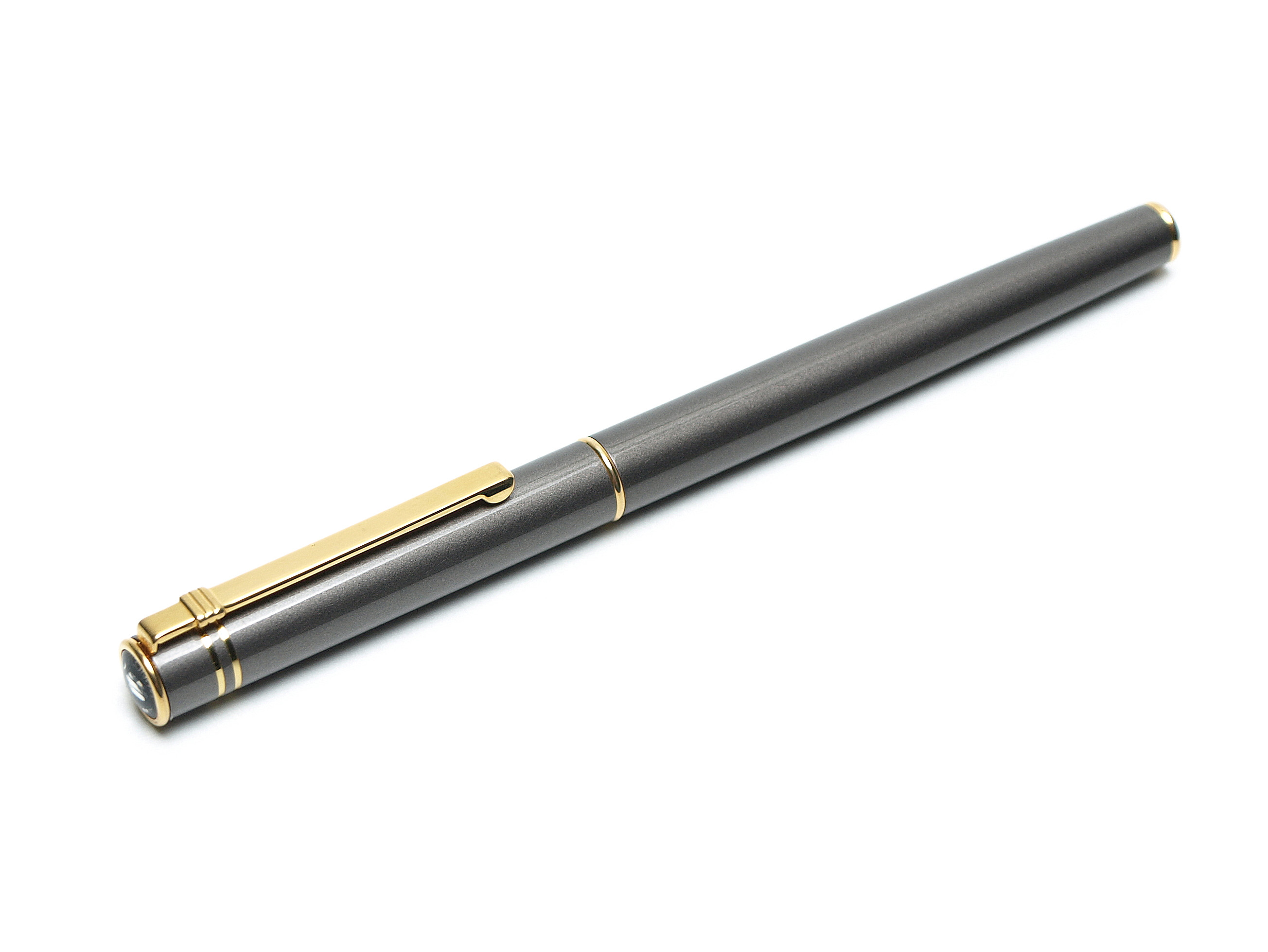 Oversize Diplomat pen. At full 140mm this is one of the biggest pens with this form factor. Pen was made in the late 1980's. The pen is a superb build quality, solid stainless steel, very heavy and with a perfect manufacturing precision. The pen features a gray metallic lacquer overlay finish, which is a perfect scratch protective cover and also give the pen a unique shine, gloss and appeal. All trimmings are thick gold plate. The pen is very heavy, with a great grip, feel and balance, which makes for a wonderful writing experience. The nib is solid steel, two tone finished gold plate, very smooth M size nib, writes perfectly without scratching the paper. The pen is in absolute mint condition, no scratches, dings or anything of the kind, never used. A truly beautiful and unique writing instrument.