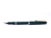 One of the most beautiful and one of the most reliable vintage Reform pens. These are one of the best pens manufactured by Reform all time. The pen offered here comes in one of the more rarely seen colors, a lovely olive green, with that beautiful vintage appeal, rarely seen in today's pens. The pen is extremely refined on a proven design and manufacturing technique; it features a high gloss plastic resin body and cap with gold plated metal parts and a stunning 14K 585 F Fine size with full flexibility. In such a nib the tines of the nib split apart as soon as it touches the paper, with no pressure. What this nib does is remarkable; it changes thickness of the lines with the little to no pressure while writing on every stroke and every letter. This nib writing is unique, as from an F grade varies to medium lines to very wide lines up to triple broad 3B, mimicking almost all nib sizes. The design and shape of the pen follows the 60s style, a very similar pen to Montblanc Monte Rosa pens, Senator and other pens, clearly distinguishable by the form, ink windows, nib and feed. This pen is in absolute mint condition, with minimal signs of use. Piston is smooth with a double seal silicone cork which always makes for a perfect fit within the body and will never leak. Original ebonite feed ensures a constant and smooth ink-flow. The pen is elongated, streamlined, fits great in the hand and has a perfect writing balance. It is very easy to clean and maintain; easily removable nib unit with a simple unscrew action. A truly astonishing vintage Reform fountain pen, made in Germany by one of the most famous brand at the time.