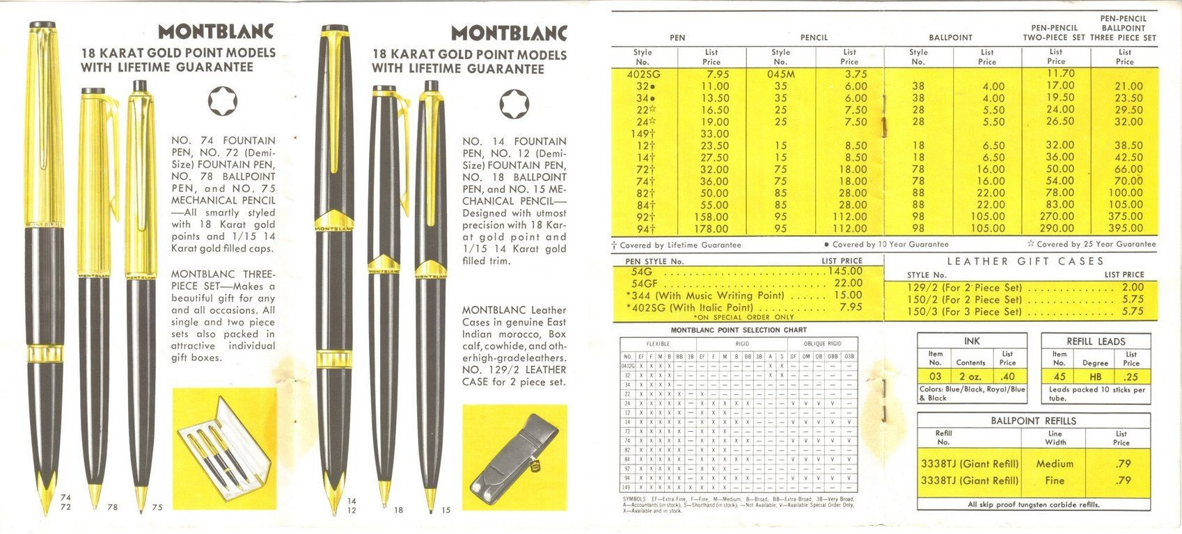 "Beyond question ...MONTBLANC is one of the finest pens you can give or own. Regardless of price, the MONTBLANC possesses an air of elegance, of classic beauty, of impeccable good taste. Long known as Europe's leading fountain pen, the MONTBLANC has superb craftsmanship ... unbelievably smooth writing action ... perfect balance. Its point is 14 or 18 karat gold. Its giant ink capacity is due to an ingenious filling system. It is proclaimed by many pen experts here and abroad to be the finest fountain pen ever designed. Aeromatic-ink control permits safe use while flying. You will treasure it as a personal possession of value and distinction, something you will be proud to own and use."