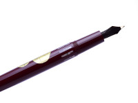 One of the rarest and best Reform sets we ever offered for sale, a unique set in a rarely seen Reform presentation box. The set consists of the famous triangular Reform fountain pen 4383 and the triangular ballpoint pen 605 in a rare burgundy red color. The unique design feature is that both pens end on each side in a triangular form giving the 4383 and 605 one of the most beautiful appeal. Made our of high quality plastic resin, the signature Montblanc material, which has a high shine and gloss but its also scratch resistant. The design and shape of the pen follows the style at the time, a very similar pen to Montblanc Mote Rosa pens, Senator and other pens. Both pens have excellent grip, weight, feel in the hand. The fountain pen at almost 140mm, posted at 165mm, it has a great balance and handling. The nib extraordinary 14K 585 nib, EF size, very smooth on the paper but with a full flexibility, rarely seen on newer pens today. In such a nib the tines of the nib split apart as soon as it touches the paper, with little to no pressure. This nib changes thickness of the lines with every stroke. Writing with such a nib is a pure joy, as from an EF grade (extra fine) varies to medium lines to very wide double broad BB line and even wider, mimicking all nib sizes, it feels like writing with a paint brush. The feed is large, ebonite with large ink canal to feed the wet nib. Piston takes good amount of ink and can be used for a long time once its filled. Silicone cork ensures no ink leakage. There are number of transparent ink windows around the barrel, that will clearly represent the ink level. All trimmings are thick gold plate that won't wear off.