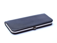 Vintage genuine black leather pouch. The pouch has 3 slots and can fit any 3 pens up to 140mm length. It's lined with grey genuine leather. The pouch features a steel chromed frame with a button release mechanism. Mint condition. High-quality leather Pouches with such quality, ergonomics and design are rarely produced these days. Such vintage pen pouches and cases are still some of the best in the world.